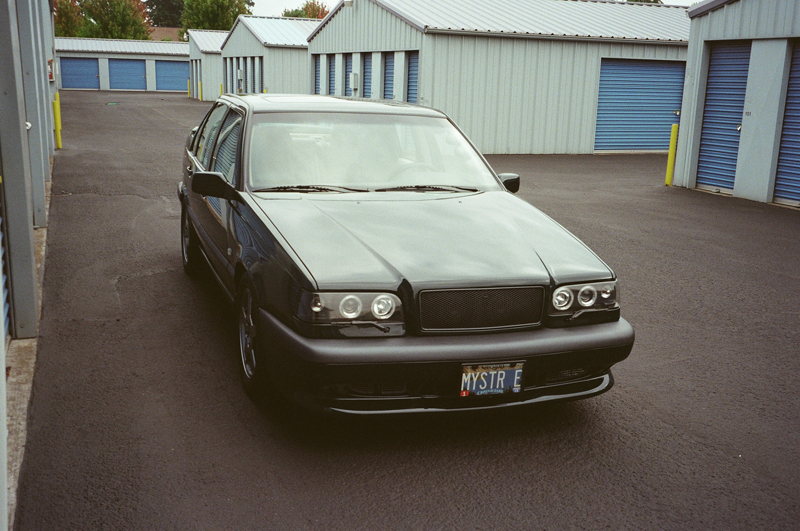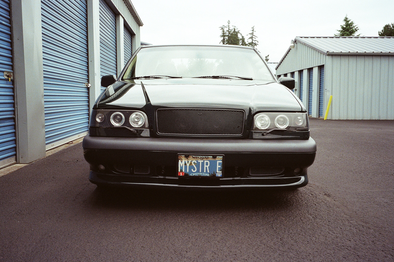 Visually, I wanted to avoid the Tricked-Out Car look and instead make the vehicle look as if the manufacturer had designed it that way. But I discarded the heavy-handed Volvo nameplate and grille emblem, which to me are on a much lower aesthetic level than the rest of the car. (The 850 grille emblem consists of four design elements jammed together: a long diagonal line, a square, the symbol for iron/Mars/male gender, and the chunky-lettered Volvo nameplate. Compare that visual hodge-podge with the elegant simplicity of the Mercedes-Benz symbol, or the Corvette crossed flags. No contest.)
